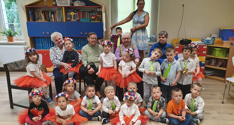 {gallery}20230506:Zdjęcie grupowe przedszkolaków oraz seniorów, dzieci ubrane kolorowo, z opaskami na głowach pozują z seniorami do zdjęcia w sali przedszkolnej.:Trzy seniorki, w tym jedna w pozycji stojącej, dwie panie siedząc prezentują poezję podczas montażu słowno-muzycznego. Sala przystrojona kwiatami.{/gallery}