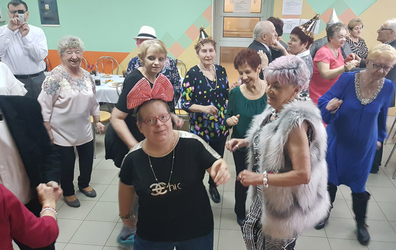 Seniorzy z DDP Nr 5 i DDP Nr 3 wspólnie bawili się w rytmach muzyki disco polo. Terapeuci zajęciowi obydwu ośrodków wsparcia zadbali o wysoki poziom atrakcji tego tanecznego spotkania dostarczając seniorom wiele radości i uśmiechu. Podopieczni obu domów byli silnie zintegrowani i zadowoleni ze spędzonego razem czasu.